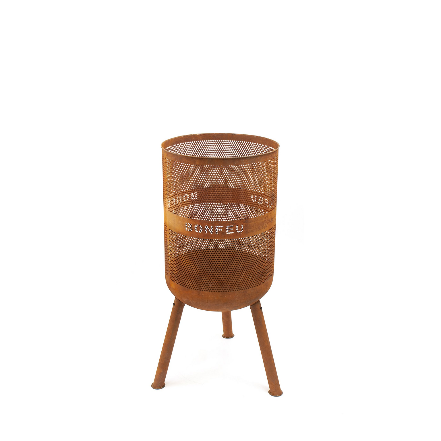 The BonVes is based on an old-fashioned washing machine drum. This type of fire pit, with a perforated drum, is known for its high heat output. In addition, the small holes in the steel have a great atmospheric effect during firing. So you can put on the fire at the bottom of the fire pit, but if you want the fire a little higher up (e.g. for cooking), you can simply hang the provided plateau with a handle at the height you want.