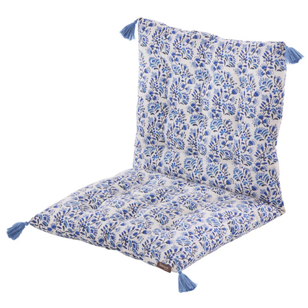 Decorative seat cushion with handmade block print in blue hues. May this floral beauty adorn your garden setup season after season.This item is out of stock online, please call us for instore availability on 015395 63630.