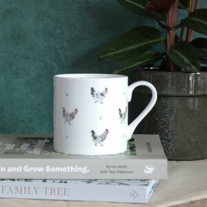 A quirky chicken mug covered in Speckled Maran hens on a white background with a few grey eggs dotted around. It would make a lovely gift for a hen keeper or chicken enthusiast.This item is out of stock online, please call us for instore availability on 015395 63630.