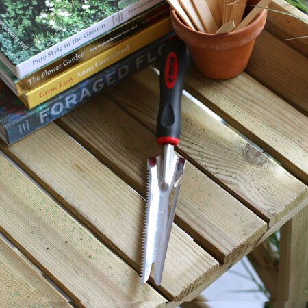 This versatile tool has five diverse applications. Use forked end for lifting weeds, the honed edge for easing plants out of pots and the saw edge to cut through small roots.This item is out of stock online, please call us for instore availability on 015395 63630.