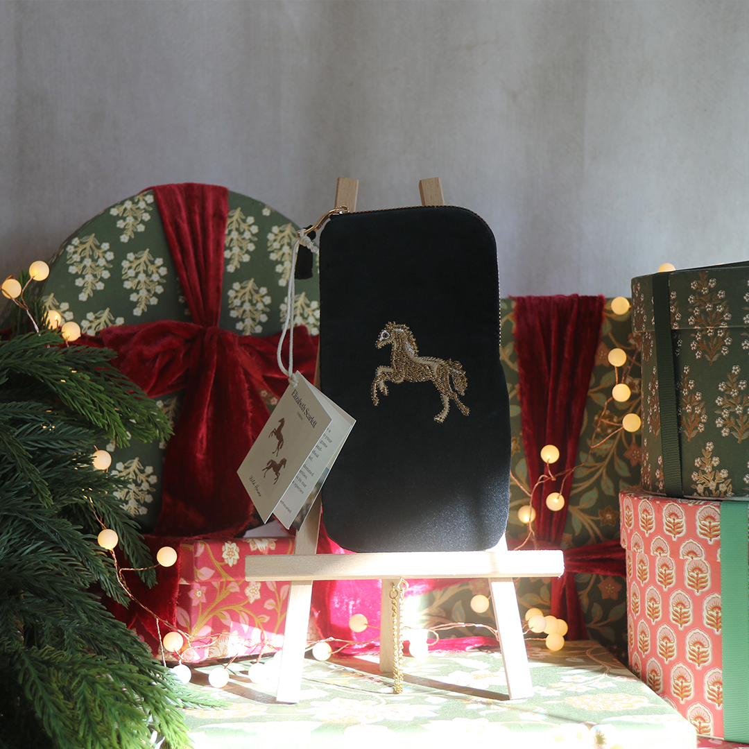 Wild, free-spirited and full of charm, Elizabeth was inspired to create this design by tales of wild horses in myth and Irish folklore. Featuring gold thread embroidery on charcoal velvet, perfect for the wild at heart.