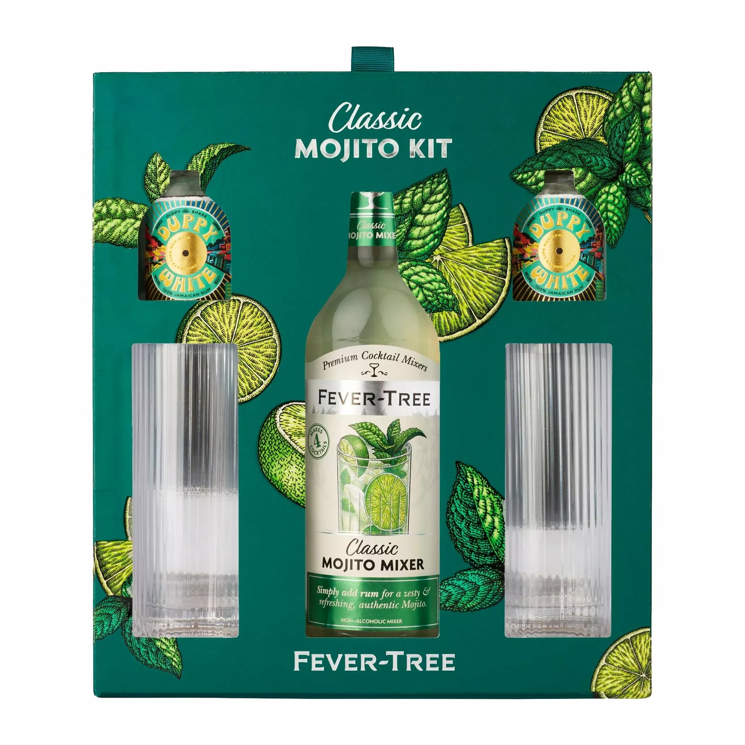 The ultimate Classic Mojito Kit: 2x Duppy White rum miniatures, 500ml bottle of Fever-Tree Classic Mojito Mixer and 2x Premium Ribbed Mojito cocktail glasses chosen to elevate your cocktail drinking experience.