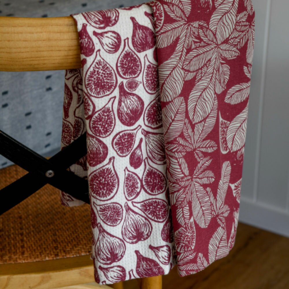 A gorgeous pack of two tea towels made from recycled cotton and screen printed with a hand drawn fig design.