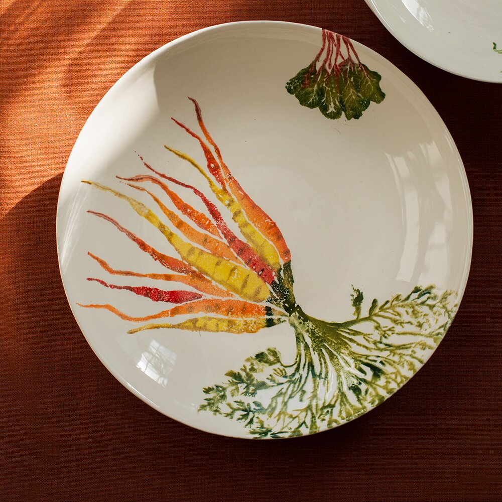 The heritage carrots artwork for this serving dish was painted in watercolour and is part of a new collection of salad and vegetable-themed homewares from UK-based brand, BlissHome. All of the pieces are hand decorated by sponge and pipette by a small family-owned factory in Italy that produces high-quality earthenware ceramic.