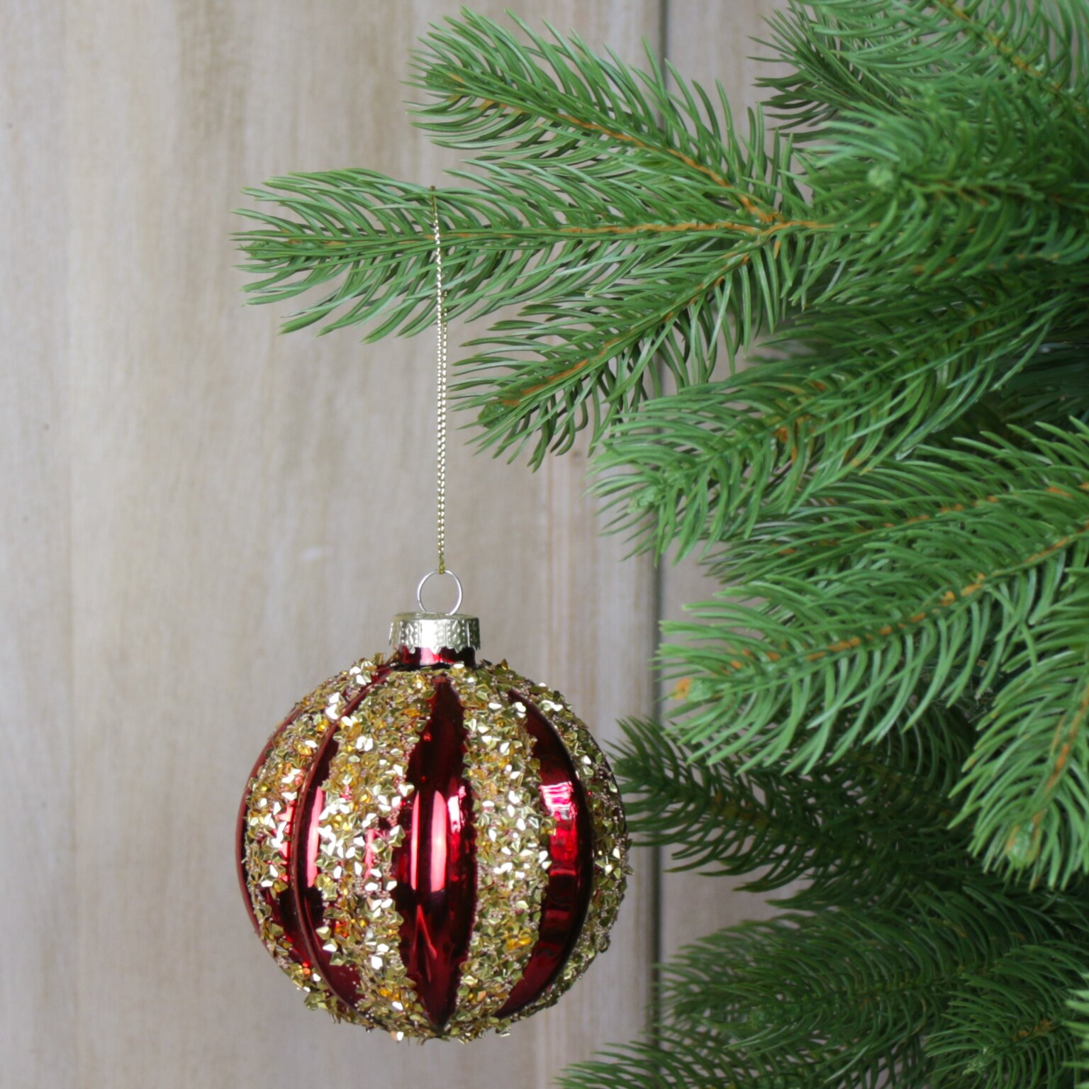 Shiny Red & Gold Glitter Ribbed Glass Bauble