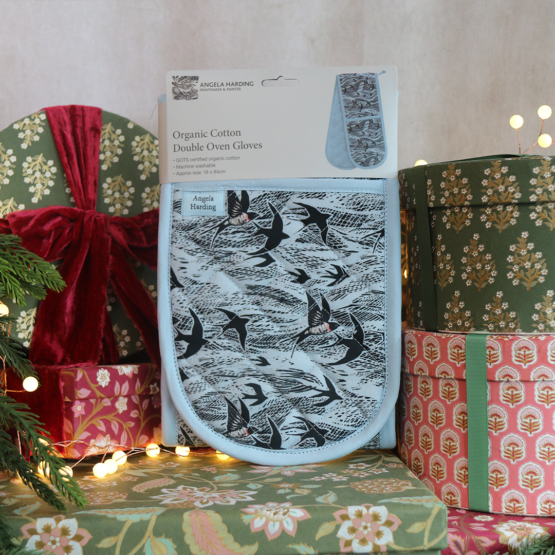 A Beautiful set of oven gloves featuring the Swallows and Sea repeat print design.