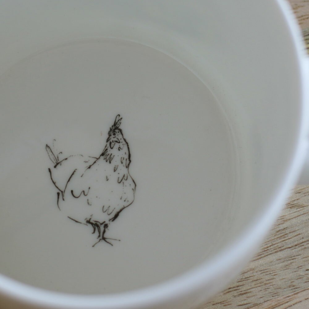 Illustrated with three golden hens on the outside, the handwritten text ‘The Golden Ladies’ on the inside of the lip and a hen hiding inside on the base, so there’s a wee surprise when you finish your cup of tea…