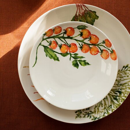 The artwork for these vine tomatoes supper bowls were painted in watercolour and are part of a new collection of salad and vegetable-themed homewares. All of the pieces are hand decorated by sponge and pipette by a small family-owned factory in Italy that produces high-quality earthenware ceramic.